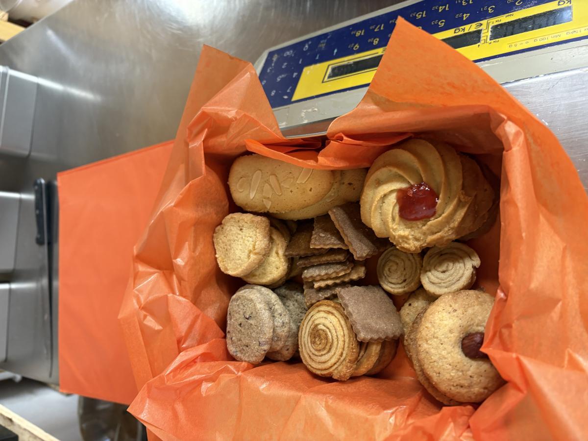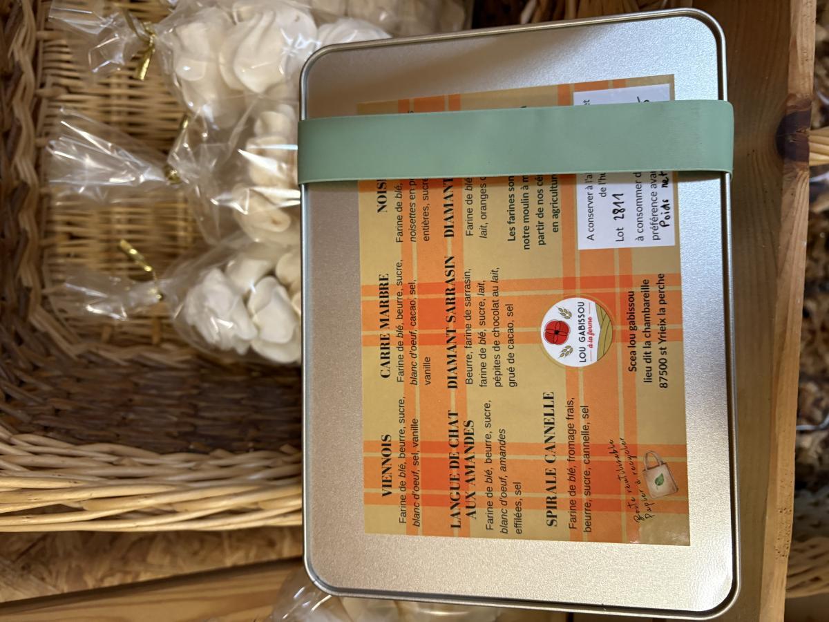 7 sortes de biscuits secs dans une boîte en fer, emballée comme un cadeau.