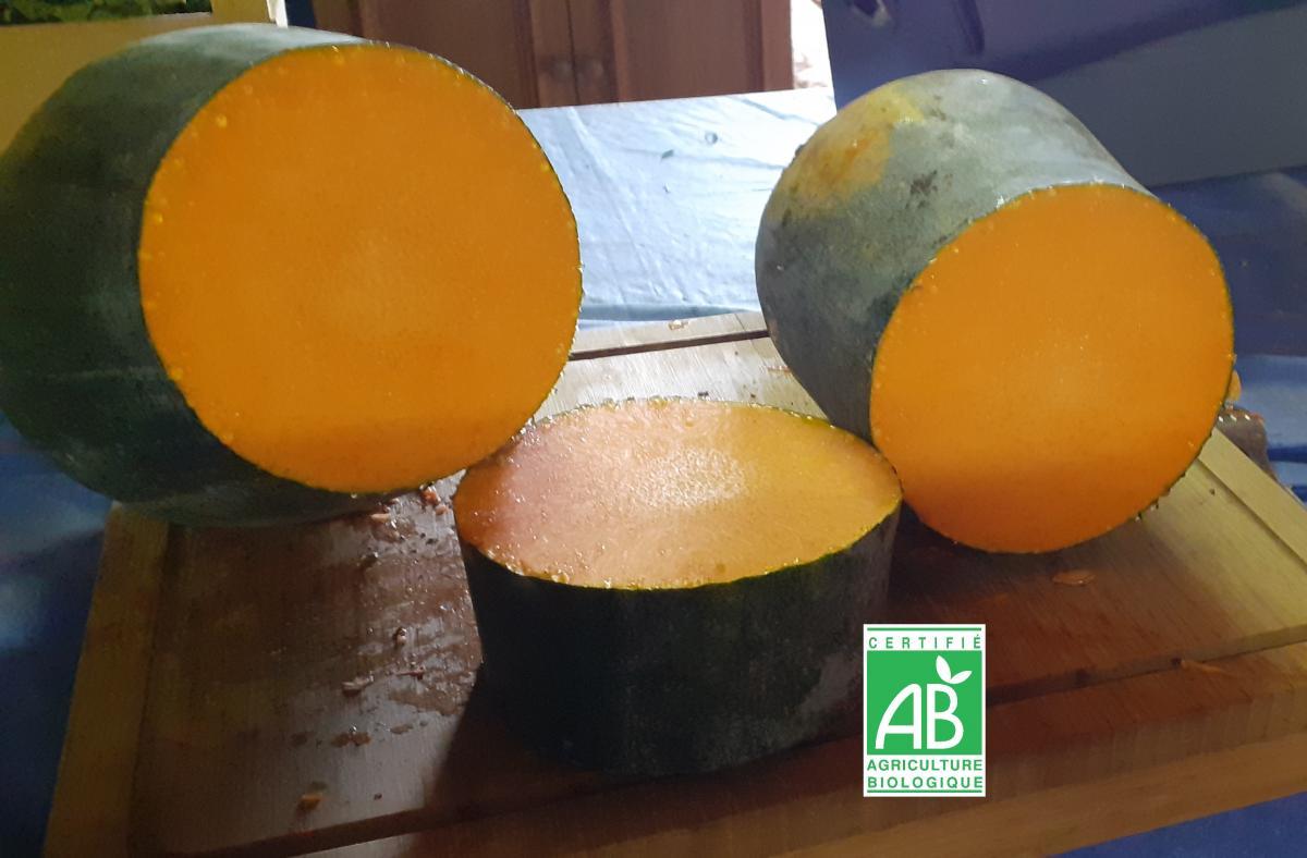 La tranche pèse entre 450g et 600 g ,elle présente une chair orange vif dense et légèrement parfumée noisette.