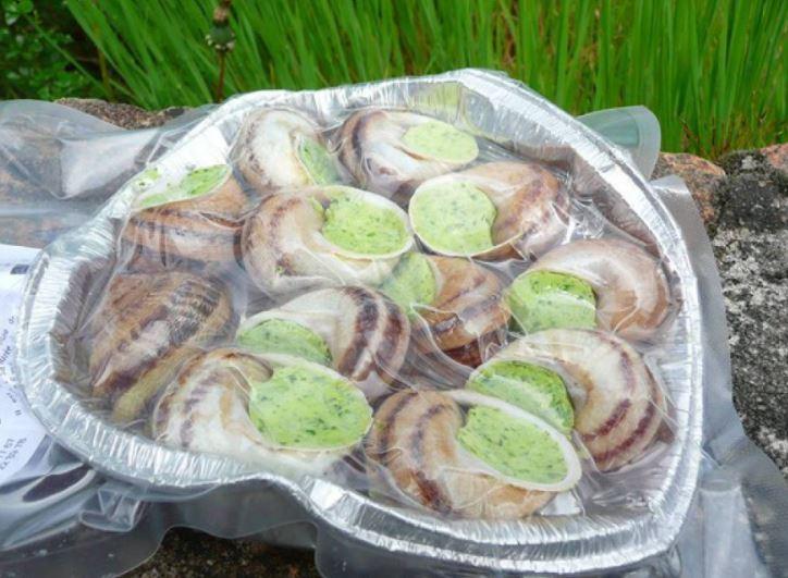 Escargots à la douzaine à la bourguignonne : beurre, ail, échalote, persil.
