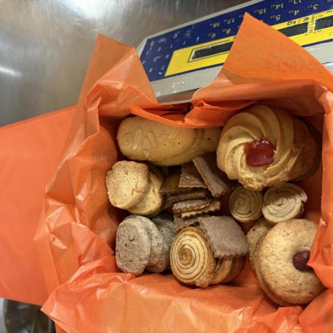 7 sortes de biscuits secs dans une boîte en fer, emballée comme un cadeau.