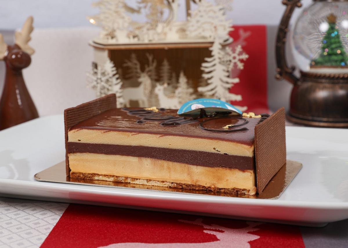 A la fois dense et corsé avec Café d'Ambre, un peu de crémeux avec Chocolaterie Lamy et un biscuit Joconde entre tout ça, voilà la bûche façon Opéra