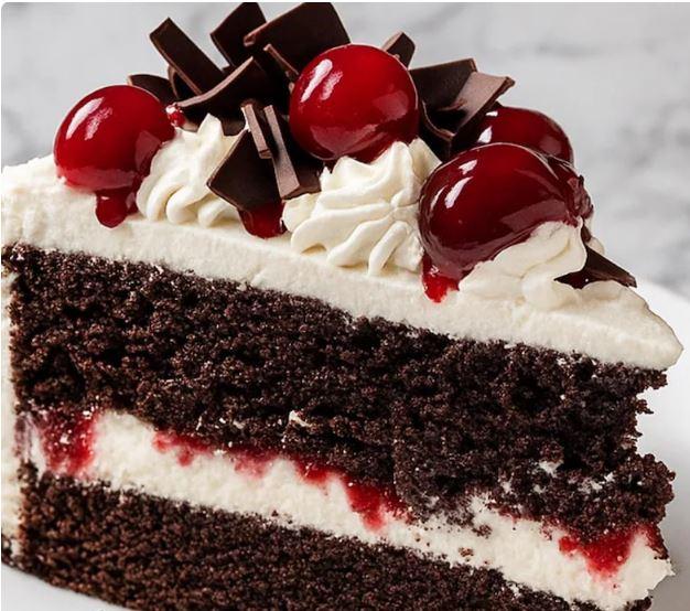 Elle est composée d'un biscuit chocolat, d'une compotée de griottes, de la chantilly et des copeaux de chocolat