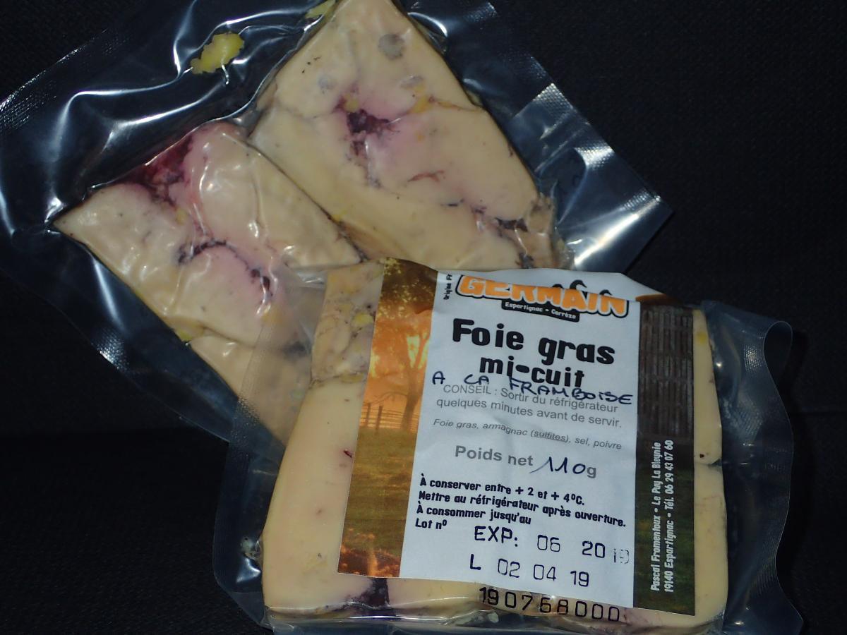Foie gras de canard, framboises 6 %, sel, poivre blanc, liqueur de framboise